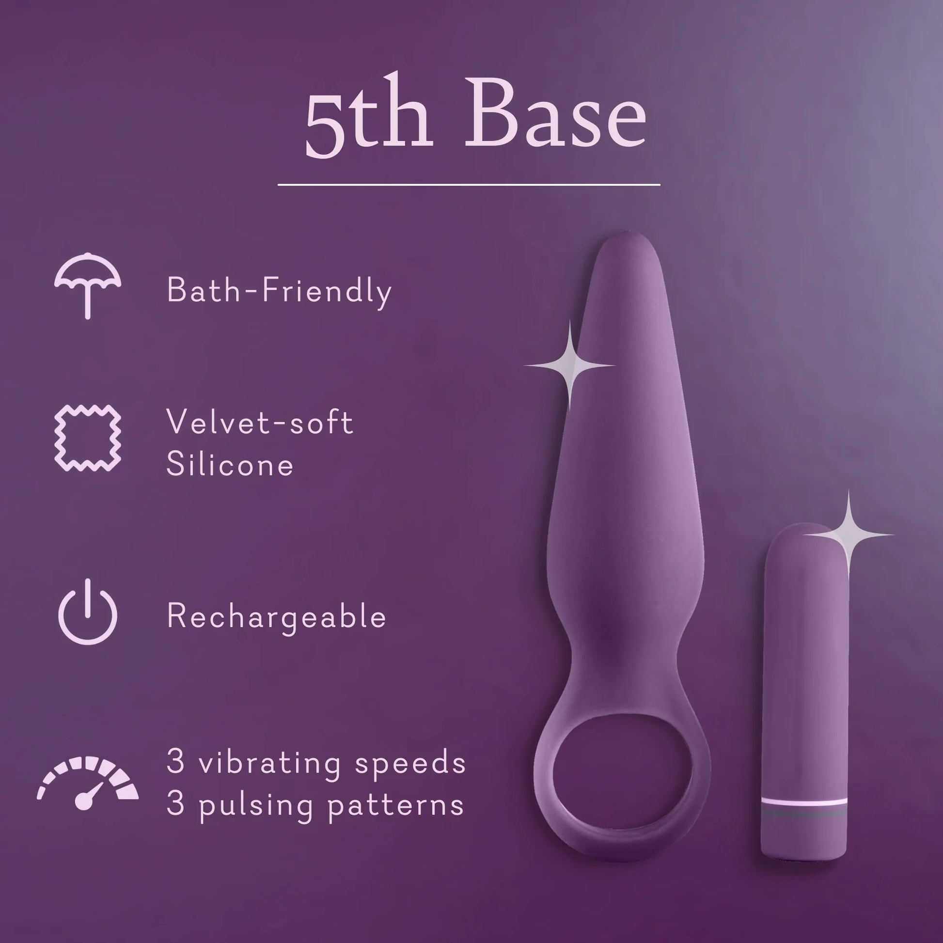 When you’re in the mood for more, take pleasure to 5th Base. This two-in-one toy features a tapered sleeve made of soft silicone and a removable, vibrating bullet. Use them both to satisfy your cravings for anal play or remove the bullet and get to second and third base—tease the nipples, clitoris, testicles and more with 3 speeds and 6 pulsing patterns. Remember to always hold the toy’s ring during play to safely excite and tantalize.